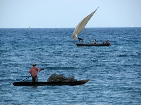 | From the end of this pier, one can sit and watch dhows and ingalawas pass by. The fishing trade is big in Zanzibar, although I'm not sure how much if any of the catch gets exported. From my experience sailing with one of the teacher's families, it isn't easy. Even the locals can have difficulty in less-than-ideal weather. |
