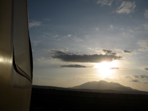 | This is one of my favourite photos, visually and for the memory it conjures. Reaching out of my backseat window and photographing the sunset over Kilimanjero. Again would have been nice to stop and take my time with it, but the urgency makes it that much more memorable. The bus must go on! |